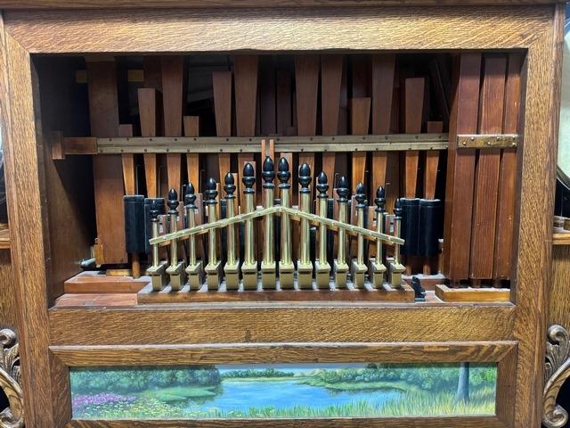 Organ Pipes: 97 total : Stopped & open bass, stopped & open accompaniment, Stopped & open melody, violin, cello, trumpet, flageolets, and piccolo.
