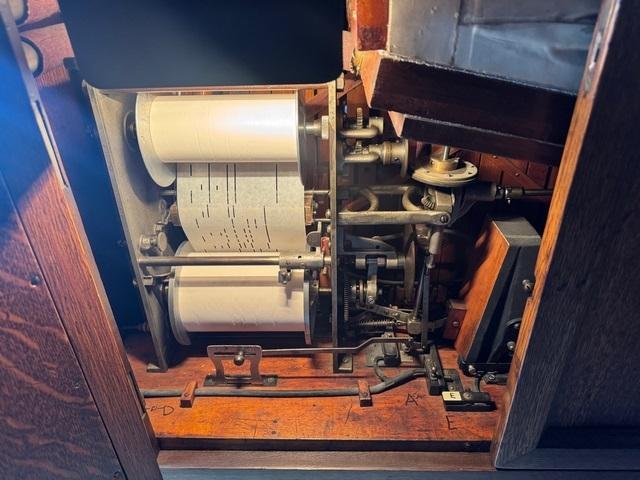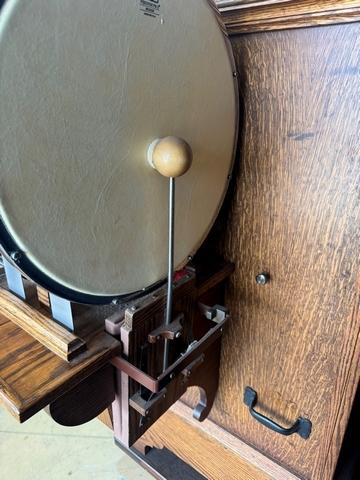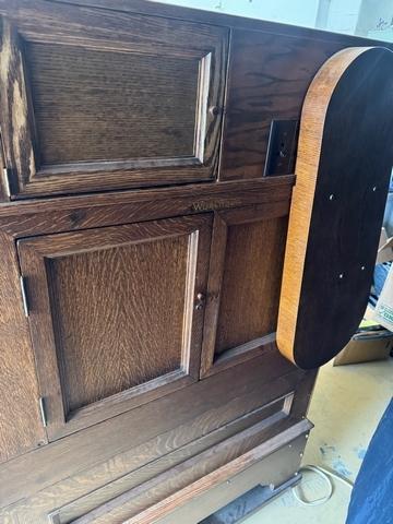 Storage cabinet can be removed with 8 small screws. Matching Oak pulley and belt cover added. Built for safely so no one can get their hands caught in the belt. Allows children to safely look closely at organ or anyone else for that matter.