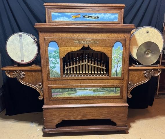 This Wurlitzer organ was manufactured in 1923 a s a style 104, serial no. 3549-6 converted in 1988 to a style 105, percussion added. Case is Quarter sawn Oak. This organ is in perfect running order! Beautiful custom hand painting on front facade. Rolls easy with heavy duty casters.